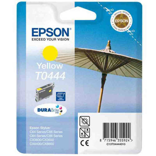 EPSON C13T04444010 tintapatron, Azonosító: C13T044440, Szín: Yellow, Kapacitás: 400 oldal, Űrtartalom: 13 ml, Kompatibilitás: Stylus C64, C66, C84, C84N, C84WN, C86, CX3600, CX3650, CX4600, CX6400, CX6600, Megjegyzés: n.a. C13T04444010