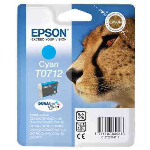 EPSON C13T07124011 tintapatron. Azonosító: C13T07124011. Szín: Cyan. Kapacitás: n.a.. Urtartalom: 5.5 ml. Kompatibilitás: Stylus D78. D92. D120. DX4000. DX4050. DX4400. DX4450. DX5000. DX5050. DX6000. DX6050. DX7000F. DX7400. DX7450. DX8400. DX8450. DX9400F. Megjegyzés: n.a.