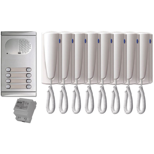 Nyolclakásos audio kaputelefon szett, mely tartalmaz mindent, ami a kaputelefon felszereléséhez szükséges. Moduláris felépítésű, ezért bármikor egyszerűen kiegészíthető, bővíthető például nagyobb lakásszámúra, kódzáras ajtónyitásra. Az erős, alumínium szerkezetű kültériegység a szükséges kiegészítőkkel falonkívül, süllyesztve és esővédővel is elhelyezhető. A nyomógombok mellett megvilágított névtáblával rendelkezik. Az esztétikus lakáskészülékekhez még két kiegészítő lakáskészüléket csatlakoztathat párhuzamosan mindegyik lakásban, melyekről gombnyomással kaput is nyithatnak.