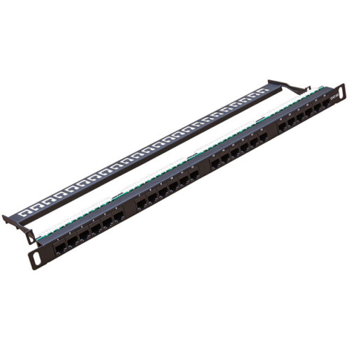 - Fekete, fém szerelőkeret. Patch panel, 24 db UTP aljzattal CAT.5e., betűzős, tehermentesítős,1U, fekete.
