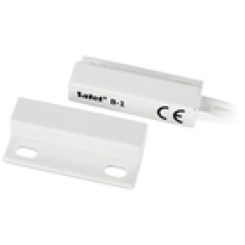 SATEL mágneses érzékelő, kis méret, fehér szín, felületre szerelhető, csavaros vagy öntapadós rögzítés, csatlakozókábel, max. kapcsolási feszültség 100V, max. kapcsolási áram 0.5A, kapcsolási távolság 24 mm, bontási távolság 29 mm, méret 28 B1
